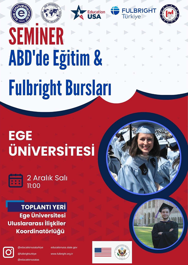 Ege Üniversitesi Uluslararası İlişkiler Koordinatörlüğünde, 2 Aralık Salı günü saat 11.00'de ABD'de eğitim ve araştırma alanlarında çeşitli fırsatlar sunan Fulbright Burs Programı ile ilgili bir bilgilendirme semineri düzenlenecektir. Burs olanakları ve ABD'deki eğitim süreçleri hakkında bilgi almak isteyen tüm öğrencilerimiz seminere davetlidir.
