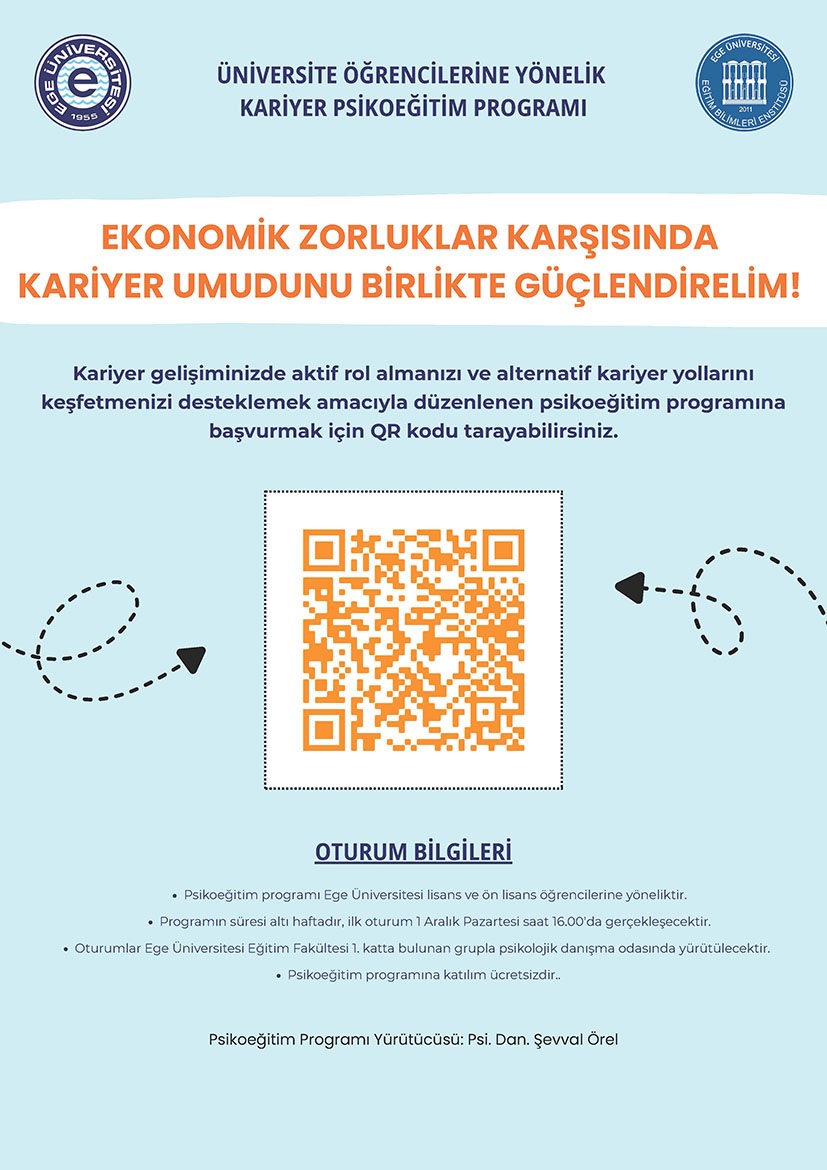 Ege Üniversitesi Eğitim Bilimleri Enstitüsü - Eğitim Bilimleri Anabilim Dalı - Rehberlik ve Psikolojik Danışmanlık Bilim Dalı tezli yüksek lisans öğrencisi Şevval ÖREL'in "Ekonomik Zorluk Yaşayan Üniversite Öğrencilerine Yönelik Umut Eylem Kuramı Temelli Geliştirilen Psikoeğitim Programının Etkililiğinin İncelenmesi" başlıklı tezi kapsamında Ege Üniversitesi Sosyal ve Beşeri Bilimler Bilimsel Araştırma ve Yayın Etiği Kurulu onaylı bir psikoeğitim programı uygulanacaktır. Programa katılmak isteyen öğrencilerimiz afişte bulunan karekodu okutup formu doldurarak başvurularını tamamlayabilirler.