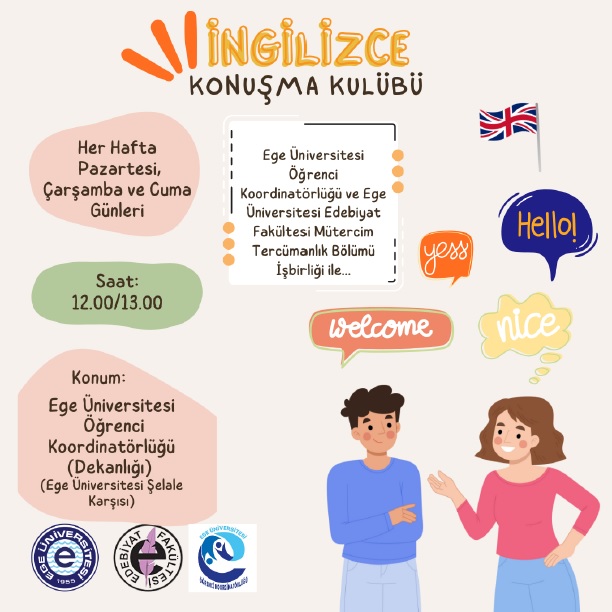 Ege Üniversitesi Öğrenci Koordinatörlüğü ile Edebiyat Fakültesi iş birliğinde, Üniversitemizde öğrenim gören tüm öğrencilerimize yönelik olarak 16 Şubat 2026 tarihinden itibaren her Pazartesi, Çarşamba ve Cuma günleri 12.00–13.00 saatleri arasında Araştırma Odaklı Öğrenci Merkezinde (AROM) ücretsiz "İngilizce Konuşma Kulübü" düzenlenecektir. Katılım için ön kayıt şartı bulunmamakta olup öğrenciler birbirinden bağımsız olan oturumlara katılabilecektir.