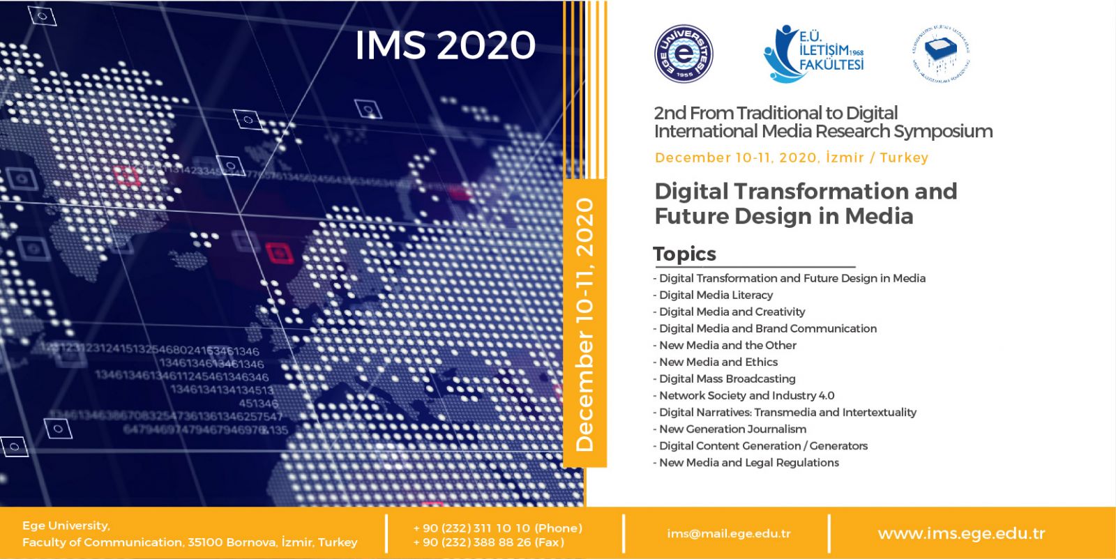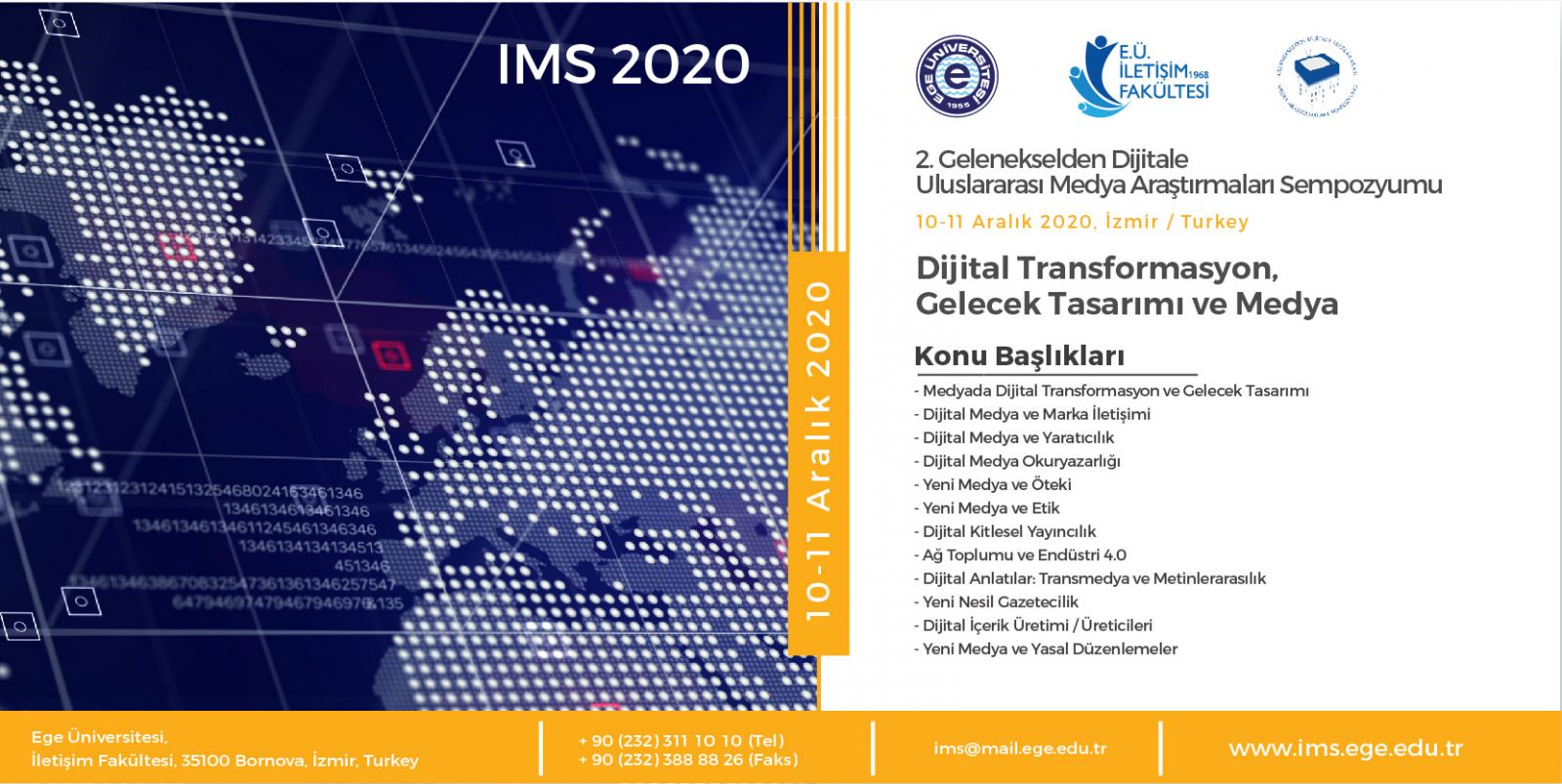II.Gelenekselden Dijitale Uluslararası Medya Araştırmaları Sempozyumu (2nd From Traditional to Dijital International Media Researches Symposium– IMS2020), 10-11 Aralık tarihlerinde video katılımlı olarak Ege Üniversitesi İletişim Fakültesi'nin ev sahipliğinde düzenlenecektir. İlkini 2018 yılında gerçekleştirdiğimiz sempozyumumuza gösterilen yoğun ilgi, hem uluslararası hem de ülkemizde iletişim, dijitalleşme ve medya alanında akademisyenlerin, uygulamacıların ve sektörde karar alıcıların bir araya gelerek sorunları ve çözümlerinin tartışılmasının devamlılık arz etmesinin ne kadar önemli olduğunun altını bir kez daha çizmiştir. Yaşam biçimlerimizi, gündelik alışkanlıklarımızı, özel ve kamusal alanlardaki etkinliklerimizi köklü bir değişime ve dönüşüme uğratan medya, dijitalleşmenin hızlı ivmesiyle birlikte gelecek toplumların sosyal, siyasi ve kültürel yapılarının yeniden tasarlanmasında etkinliğini koruyacaktır.